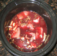 Красное сухое вино, грибы Предварительно замаринованная в красном вине говядина тушится с обжаренными овощами и грибами в соусе из красного вина и говяжьего бульона.