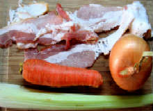 Лук нарезать полукольцами, морковь - полукружьями, сельдерей - поперек волокон.