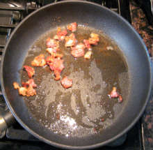 На тяжелой сковороде с высокими бортами поджарить кусочки бекона до румяной корочки и удалить из сковороды. Если вытопленного жира недостаточно - добавить сливочного масла.