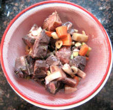 | Красное сухое вино, грибы | Предварительно замаринованная в красном вине говядина тушится с обжаренными овощами и грибами в соусе из красного вина и говяжьего бульона. |