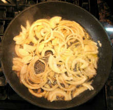 Добавить порезанный пластинками чеснок, слегка подрумянить, выложить лук и чеснок со сковороды.