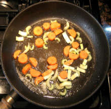 Лук нарезать полукольцами, морковь - полукружьями, сельдерей - поперек волокон.
