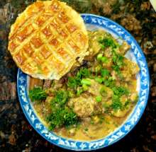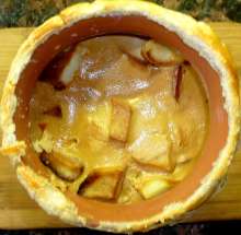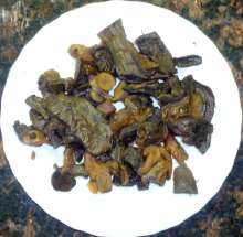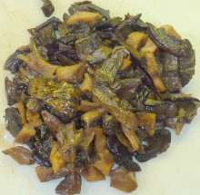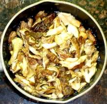 Сухие грибы. Предварительно обжаренные мясо, лук, отваренные грибы тушатся с томатом, добавляется обжаренный картофель, ингредиенты заливаются сметанным соусом с добавлением томата и томятся в горшочках, покрытых тестом.