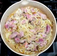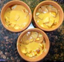 В оригинальном рецепте картофель режется соломкой, но в случае подачи в горшочках это нецдобно – при перемешивании картофель неизбежно развалится.