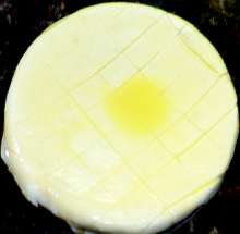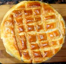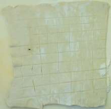 Лист слоёного теста раскатать до толщины 3 мм. Ножом нанести сетку, не прорезая пласт до конца.