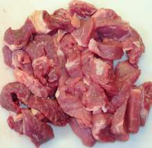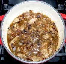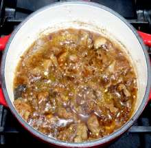 Если у вас вырезка – выложить поджаренное мясо с луком в горшочки (см. ниже). Но как правило вырезки под рукой нет (мясо это самое дорогое), а есть обычная мякоть для тушения. Поэтому я всегда дотушиваю мясо до готовности перед выкладыванием в горшочки. Для этого мясо с луком выложить в толстостенную кастрюлю, залить кипятком так, чтобы жидкость покрывала ингредиенты, поставить на малый огонь.