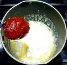 Добавить томатную пасту, перемешать. добавить бульон от тушения мяса и от варки грибов, снова перемешать до однородной консистенции, следя за тем, чтобы исчезли комки.