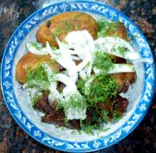 Баранье сало, зира, кориандр | В казане вытапливается бараний жир, в нём, как во фритюре, обжаривается картофель целиком, затем обжариваются куски мяса. Лишний жир убирается, в казан возвращается мясо и картофель, добавляется соль и специи, казан накрывается крышкой и выдерживается на малом огне 40-60 минут до готовности картофеля. При подаче заправляется маринованным луком и зеленью. |