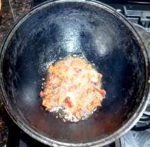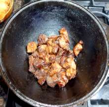 Тут кроется вторая проблема: масла в казане немного, поскольку ингредиенты должны не жариться, а запекаться, но очень трудно без опыта отрегулировать температуру так, чтобы нижний слой мяса не зажарился и не сгорел. Поэтому некоторые кулинары добавляют в казан немного кипятка – так спокойней.
