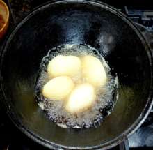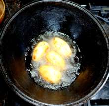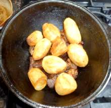 Поджарить картофель до золотистой корочки. Затем удалить его из казана и обжарить остальной картофель.