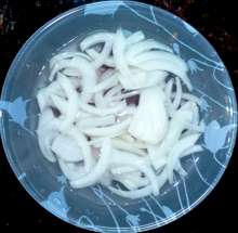 Тем временем лук нарезать тонкими четвертькольцами, залить растворенным в воде уксусом.
