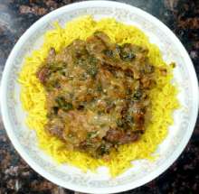| Сванская соль, кинза. | Мясо, нарезанное брусочками, обжаривается в растительном масле, добавляется лук, блюдо тушится без добавления воды до мягкости лука, добавляется зелень, сванская соль, чеснок, блюдо тушится до изменения цвета зелени. Подается с рисом, отваренным в бульоне с имеретинским шафраном или куркумой. |