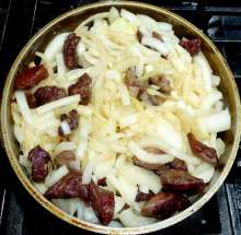Выложить лук к мясу.