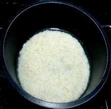 Поставить кастрюлю на огонь, варить до готовности риса.