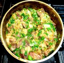 Изумительно нежное и ароматное мясо. Особенность - мясо тушится с луком без добавления воды. Аромат достигается за счет использования Сванской соли и большого количества кинзы. Готовится просто, испортить трудно.