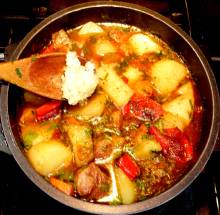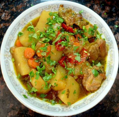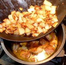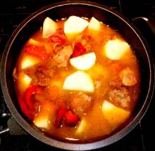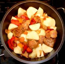 В оригинальном рецепте мясо тушится 20 минут вместе с поджаренными овощами и картофелем, но так можно готовить только хорошее мясо. Я же в свём мясе не уверен и думаю, что за 20 минут оно не приготвится, поэтому добавил дополнительное тушение.