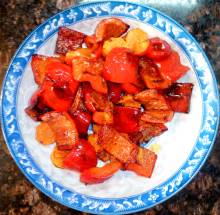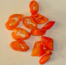Перец нарезать квадратами с такой же стороной, как и мясо.