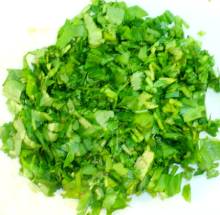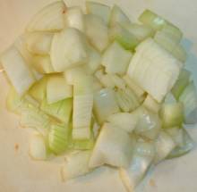 Лук разрезать пополам, половинки нарезать на 4 части, затем прямоугольниками (т.е. в два раза крупнее, чем мелкий кубик).