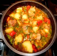 Сладкий перец, кинза, паприка, молотый кориандр, хмели сунели, бульон Поджаренные кусочки мяса выкладываются в толстостенную кастрюлю, заливаются бульоном, тушатся почти до готовности. Тем временем морковь, лук, болгарский перец обжариваются поотдельности, добавляются к мясу вместе с острым стручковым перцем. Следом добавляется картофель, ингредиенты перемешиваются, доливается бульон и жаркое тушится под крышкой до готовности картофеля. За 5 минут до готовности добавляется рубленная кинза, молотый кориандр, паприка, хмели сунели, соль. При подаче жаркое заправляется свежей зеленью.