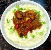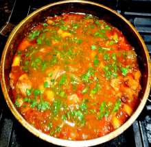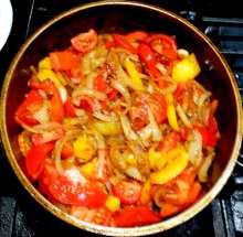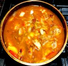 Смалец, сладкий перец, помидоры, чеснок, паприка. | Кусочки мяса поджариваются в свином жире. В сотейник выкладывается лук, последовательно добавляются сладкий перец и помидоры. Зажарка заправляется паприкой, в сотейник возвращается мясо, ингредиенты заливаются бульоном и тушатся до готовности мяса. По готовности блюдо заправляется рубленной зеленью и чесноком. Подается с любым простым гарниром. |