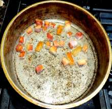 Свиной бекон нарезать небольшими кубиками. Выложить в нагретый сотейник.