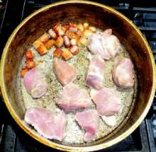 Кстати: В оригинальном рецепте мясо поджаривается в смальце (это венгерский вариант), но у меня его не было и я заменил его беконом. Допускается также обжарка на растительном масле.