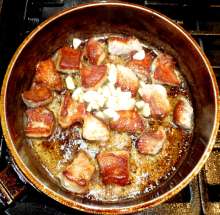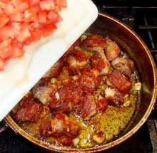 Жемчужный лук, помидоры, красное вино, чеснок, корица. | Кусочки свинины поджариваются на оливковом масле, затем тушатся с чесноком, помидорами и специями в соусе (сухое вино, уксус, томатная паста), в середине тушения добавляется поджаренный мелкий лук и блюдо тушится под крышкой до готовности. |