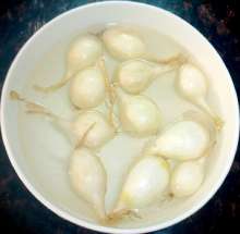 Как правило, в этом блюде применяется очень мелкий (т.н. «жемчужный») лук. У меня – сеянец.Эта процедура позволит затем легко очистить лук. Без этого он чистится трудно.