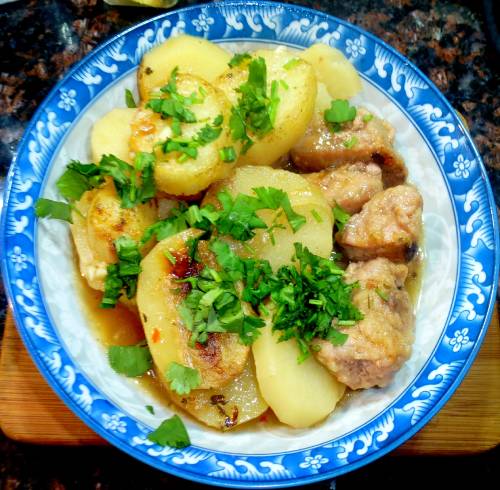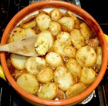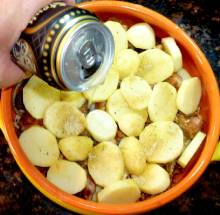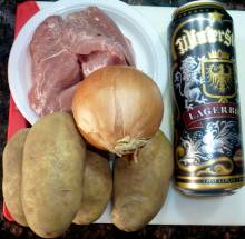 | Пиво. | В форму для запекания слоями выкладываются картофель, жареный лук, поджаренное мясо и снова картофель. Ингредиенты заливаются пивом и запекаются под крышкой 1.5 часа при 200 С. По готовности картофеля форма без крышки остается в духовке до появления легкой корочки. При подаче блюдо заправляется чесноком и зеленью. |