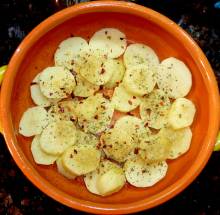 Мясо покрыть второй половиной картофеля, посолить, поперчить, посыпать специями.