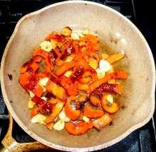 Перемешать, жарить до подпалин перца, следя за тем, чтобы чеснок не пригорел.