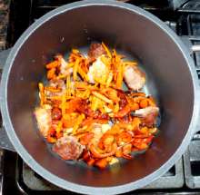 Выложить мясо и поджаренные овощи в толстостенную кастрюлю.
