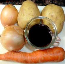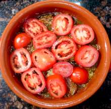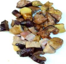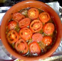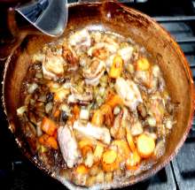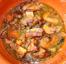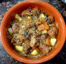 Вино, грибы Кусочки свинины обжариваются на оливковом масле, ароматизированном чесноком. Так же обжариваются лук, морковь, грибы. Ингредиенты соединяются, добавляется вино и вода, всё тушится до полуготовности мяса, затем выкладывается в горшочек. Следующим слоем выкладывается картофель, добавляются специи, затем - нарезанные помидоры. Блюдо тушится в духовке, разогретой до 200 С, до готовности картофеля.