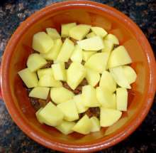 В оригинальном рецепте вся мясо-овощная смесь выкладывается на дно горшочка, но я решил утопить в ней картофель - так он должен приготовится быстрее, чем при прямом контакте с помидорами.