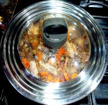 В оригтнальном рецепте мясо с овощами так долго не тушат, но в нём использовалась телятина, которая готовится быстро, а у меня - свиниые рёбрышки. Я тушу мясо в сковороде почти до готовности, поскольку затем при медленном тушении в горшочке оно переготовлено не будет, зато гарантированно будет готово.