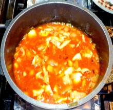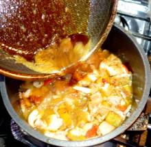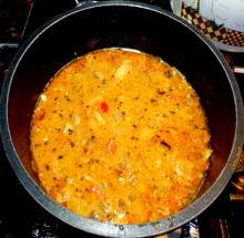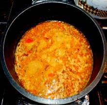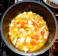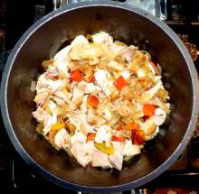 Налить куриного бульона (у меня - бульонный кубик) так, чтобы жидкость только покрыла ингредиенты.