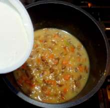 Добавить муку, перемешать. Жарить на малом огне 1 минуту.