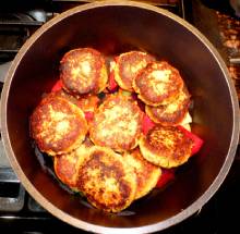 В толстостенный казанок выложить кружки моркови и кусочки свеклы. Поверх уложить обжаренные котлетки.