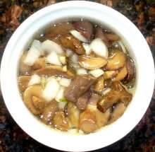 Подсолнечное масло, лук, чеснок | Солёные грибы смешиваются с сырым луком, рубленным чесноком и заправляются подсолнечным маслом и уксусом. |
