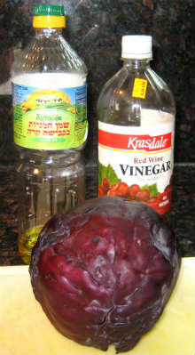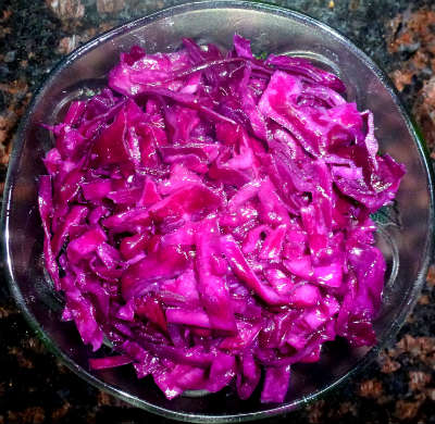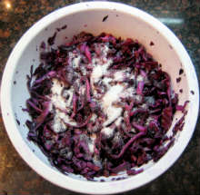| Сахар, кунжутное масло | Краснокачанная капуста шинкуется соломкой, перетирается с солью, заправляется подсолнечным, кунжутным маслом и сахаром. |