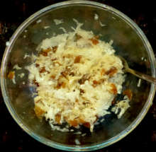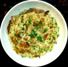 | Кунжутное масло, уксус, жареный лук | Натертый на средней терке и отжатый от сока дайкон смешивается с жареным луком и заправляется солью, перцем, зеленью, подсолнечным и кунжутным маслом, уксусом. |