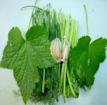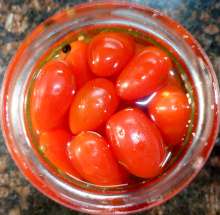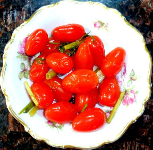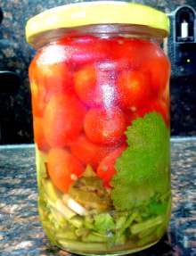 | Горчица, сахар, душистый перец. | В банку укладываются стебли зелени, нарезанный пластинками чеснок, перец горошком, горчица. Поверх выкладываются наколотые помидорки, ингредиенты заливаются кипящим рассолом (вода, соль, сахар) и выдерживаются на холоде до нужной степени солёности помидор. |