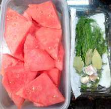 | Укроп, чеснок, уксус. | В банку укладываются стебли укропа, чеснок, лавровый лист, перец горошком. Поверх неплотно выкладываются кусочки арбуза без корки, ингредиенты заливаются горячим рассолом (вода, соль, сахар, уксус). Банка закрывается крышкой и выдерживается 2-3 недели в холодильнике. |