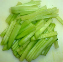 Огурец очистить и нарезать соломкой.