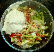 Оригинальное сочетание свежих овощей, курицы, сметаны и сыра.