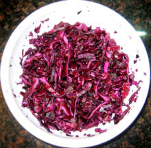 Сахар, кунжутное масло Краснокачанная капуста шинкуется соломкой, перетирается с солью, заправляется подсолнечным, кунжутным маслом и сахаром.