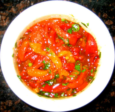 Мёд, чеснок, кунжутное масло Перец запекается, очищается от кожицы, нарезается соломкой, обжаривается в масле с добавлением разбавленного мёда, заправляется чесноком и зеленью, заливается маринадом (оливковое масло + соевый соус + лимонный сок + кунжутное масло).