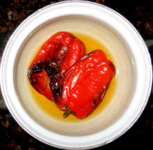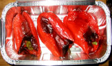 Вымытый перец целиком уложить в форму дkя запекания. Запекать на гриле или в духовке (350 C) до появления подпалин.