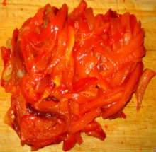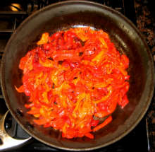 При добавлении перца к раскаленному маслу может быть много брызг, так как перец насыщен жидкостью, выделившейся в процессе запекания. Нужно иметь наготове крышку, а лучше - готовить на улице, если есть возможность.