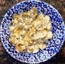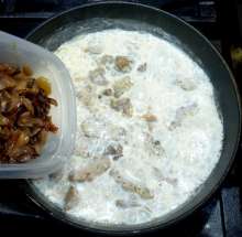 | Жареные грибы с луком, жареная куриная печёнка. | Жареная куриная печёнка, нарезанная ломтиками, выкладывается в сковороду с растопленным сливочным маслом, прогревается, добавляется молоко и жареные грибы с луком, блюдо тушится 5-7 минут. |